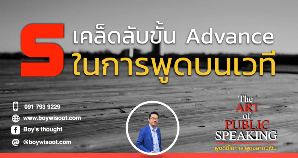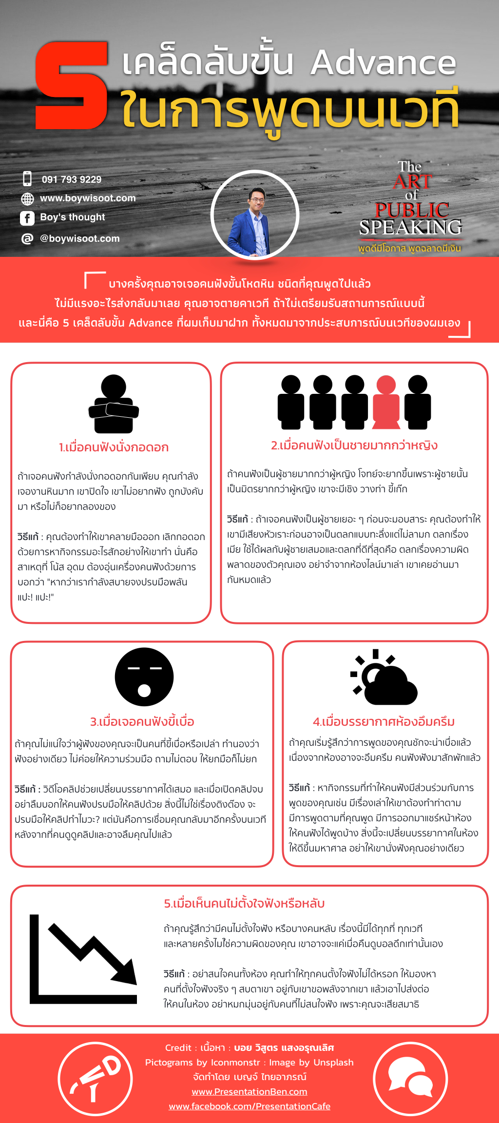 ผมได้สรุปเนื้อหา 5 เคล็ดลับขั้น Advance ในการพูดบนเวทีไว้เป็น Infographic ที่อ่านง่ายๆใช้เวลาสั้นๆในการทบทวนดังต่อไปนี้