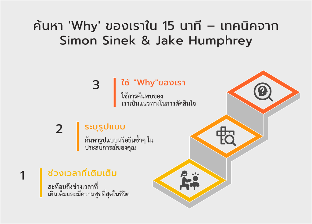 นำคำถามที่ Simon Sinek ใช้กับ Jake Humphrey มาสรุปเป็น กระบวนการสำคัญ ที่ช่วยให้เข้าใจว่า What, How, และ Whyของแต่ละคนสามารถค้นหาได้อย่างไร