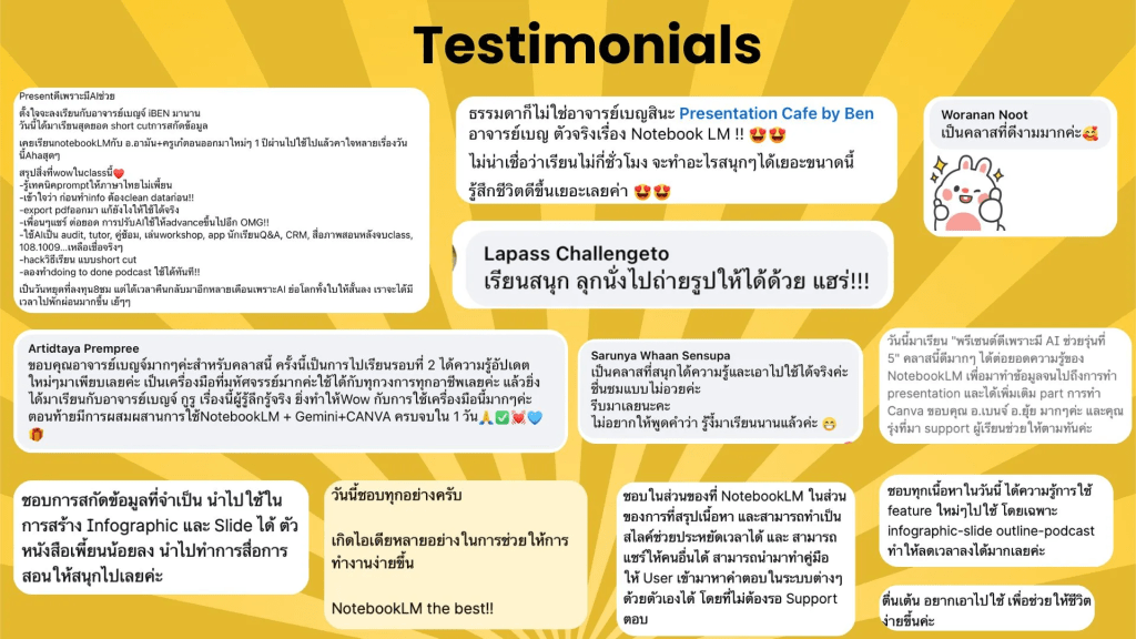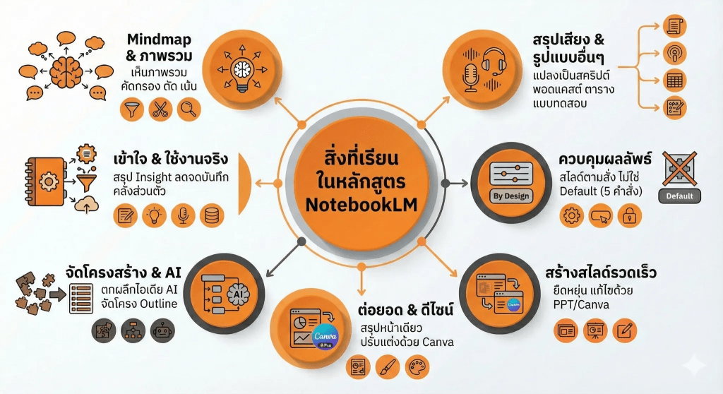 - หลักสูตรนี้แตกต่างจากคอร์ส AI หรือคอร์ส Presentation ทั่วไปอย่างไรเน้นการจัดการเนื้อหาและความคิดก่อนการนำเสนอ โดยใช้ NotebookLM เป็นแกนในการสรุป วิเคราะห์ และกลั่นข้อมูลจากเอกสารจริง เพื่อให้ได้โครงสร้างที่พร้อมนำไปสื่อสารต่อ ไม่ว่าจะเป็นสไลด์ เอกสาร หรือสื่อรูปแบบอื่น