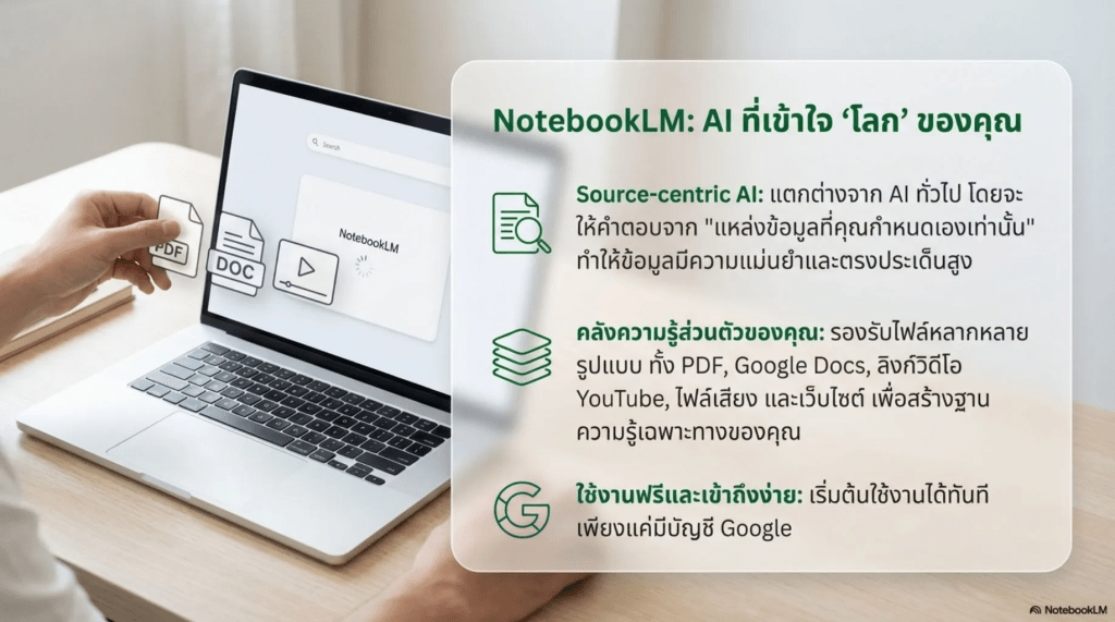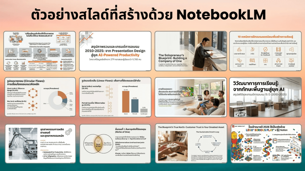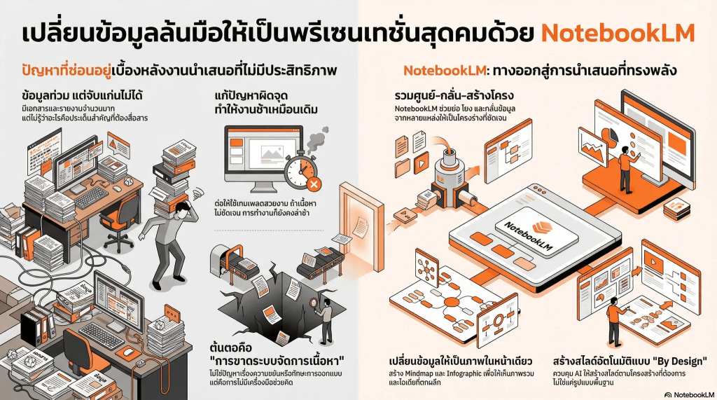 สิ่งที่ทำให้งานนำเสนอเร็วขึ้นและทรงพลังอย่างแท้จริง ไม่ใช่ความเร็วในการลากวางสไลด์ แต่คือความชัดเจนที่ต้นทาง (Content Structure) และนี่คือจุดที่ NotebookLM จะเข้ามาเปลี่ยนวิธีทำงานกับข้อมูลมหาศาลให้กลายเป็นระบบที่ดียิ่งขึ้น