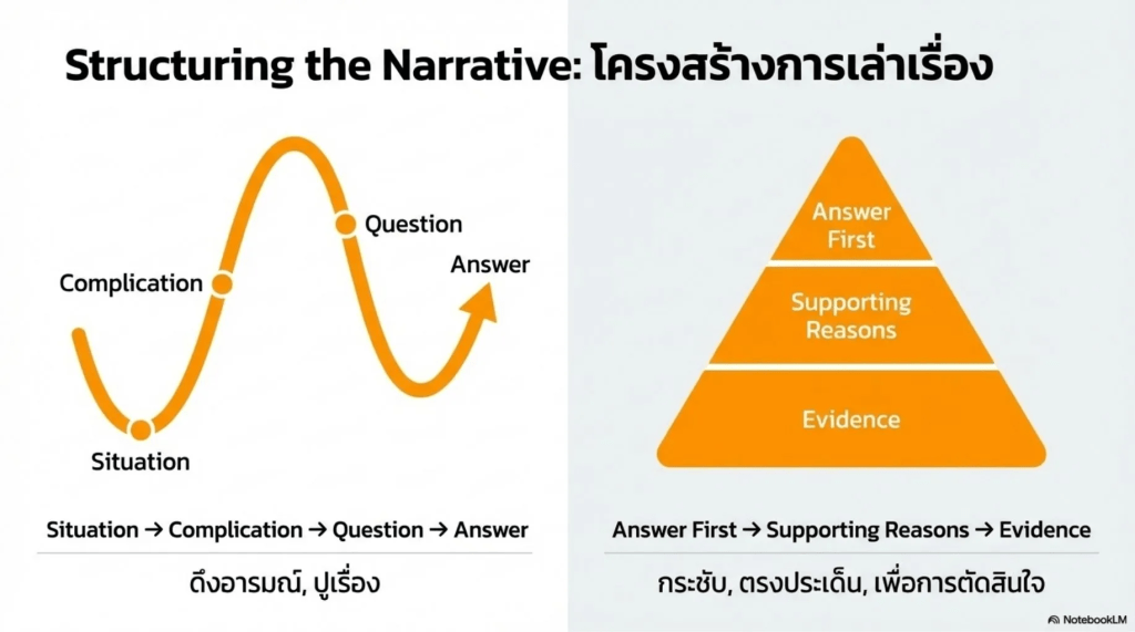 - บ่อยครั้งที่งานนำเสนอพังลงไม่ใช่เพราะสไลด์ไม่สวย แต่พังเพราะเนื้อหาที่กระจัดกระจายทำให้คนทำงานเองก็ยังไม่เห็นภาพชัดเจนเพราะข้อมูลเยอะก็จริงแต่มันขาดทิศทาง