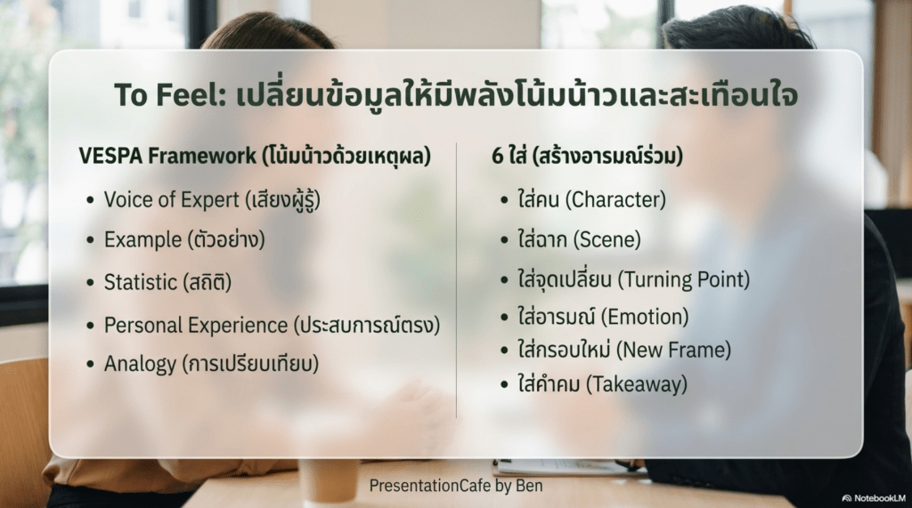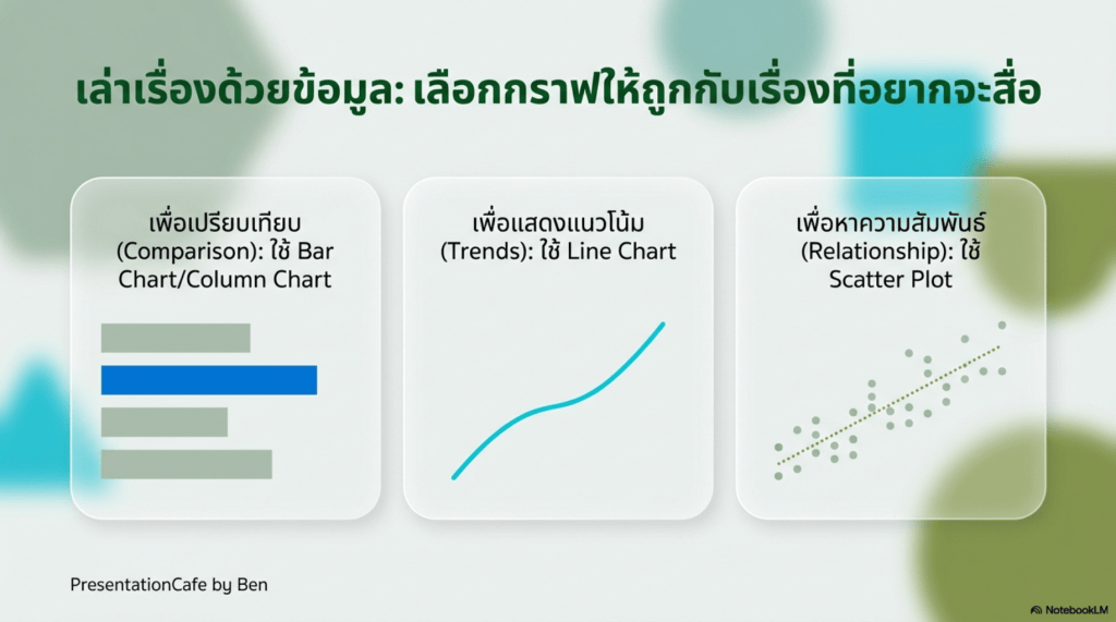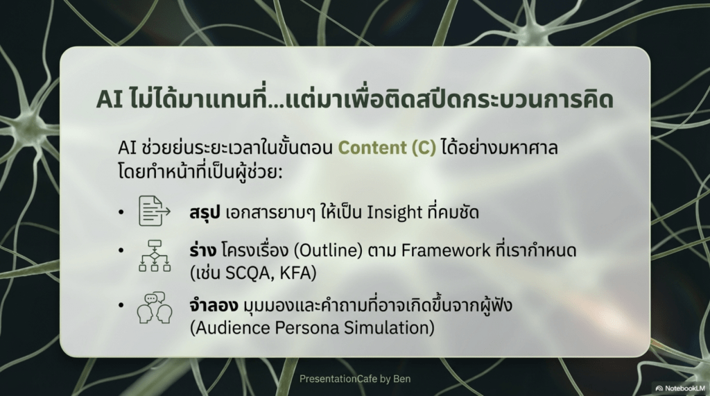 - กรณีงาน High Stakes: หากเป็นงานประเภทไป Pitch ขอทุน ไปนำเสนอขายสินค้าให้ลูกค้าเจ้าใหญ่ หรือต้องขึ้นพูดต่อหน้าชุมชนคนเยอะๆ การหยิบสไลด์จาก NotebookLM ไปใช้ตรงๆ อาจจะไม่เหมาะเท่าไหร่นัก